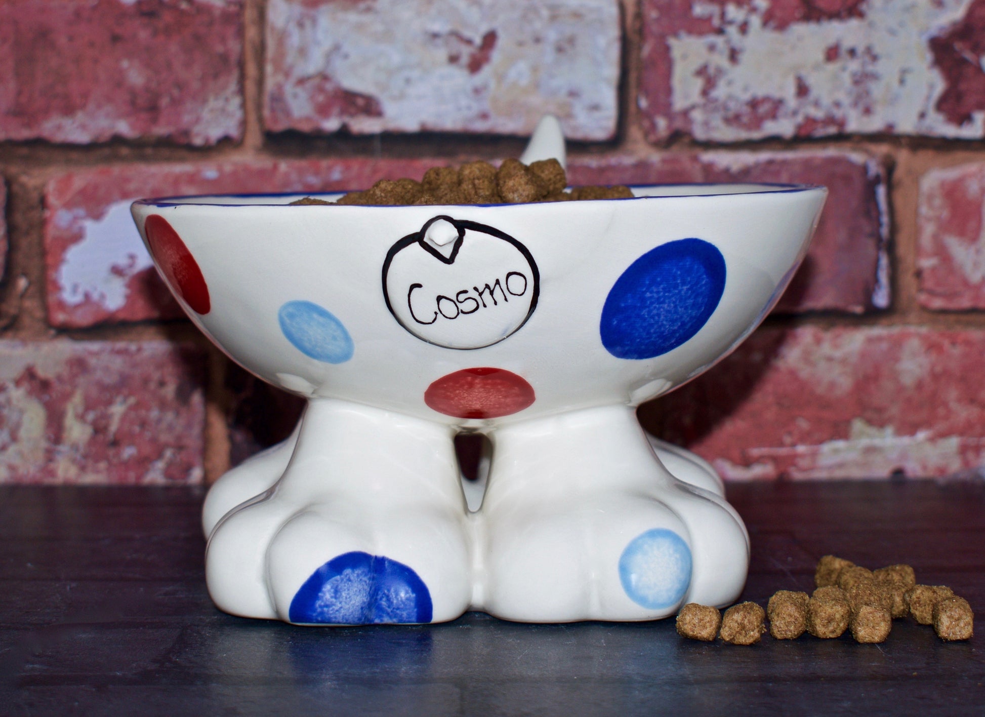 Add a splash of personality to your pup’s mealtime with this whimsical elevated bowl, lovingly hand-painted just for them! The bowl features a stylish spotty design in your choice of colours - whatever suits your furry friend’s vibe!