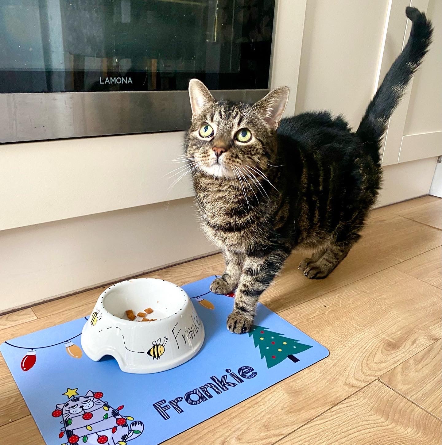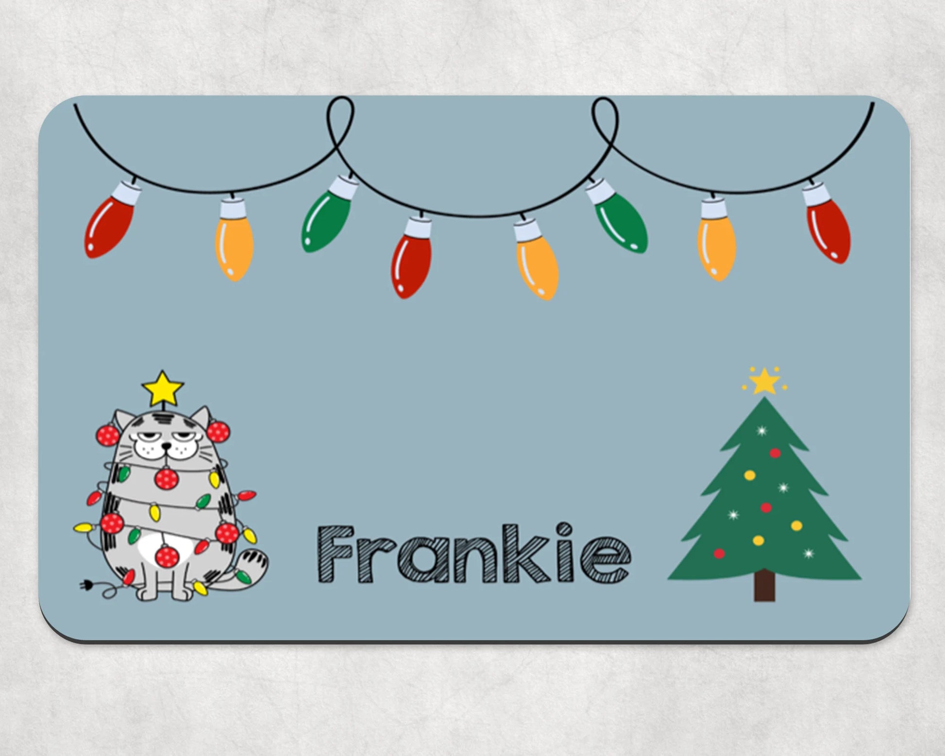 Tired of mealtime mayhem? 🐾 This Christmas, embrace the chaos with our Personalised Pet Bowl Mats. Featuring a festive scene of twinkling lights, a mischievous cat tangled up in them, and a decorated Christmas tree (still standing… for now).