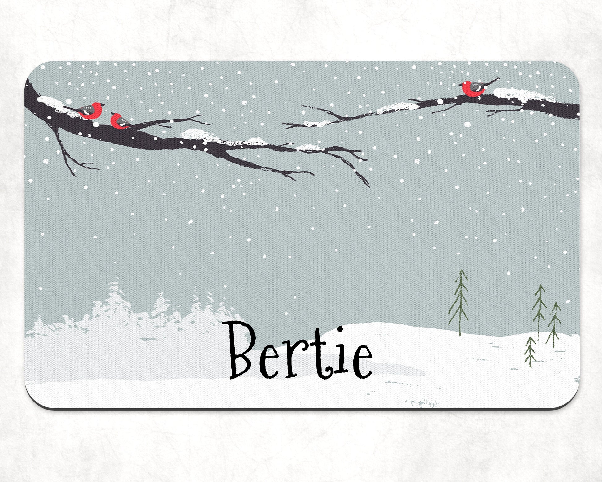 Bring a touch of festive magic to your pet’s mealtime with our Personalised Pet Bowl Mats, featuring a serene snowy scene with delicate tree branches and cheerful robins perched among them. It’s a cosy winter moment captured just for your furry friend’s dining spot.