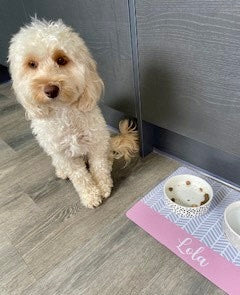 This playful design features a soft grey herringbone background and a bold stripe in your chosen colour—personalised with your pet’s name in white in the font of your choice. It’s cute, clean, and totally custom, adding a splash of fun to your feeding setup without overpowering your space. 🐶🐱✨