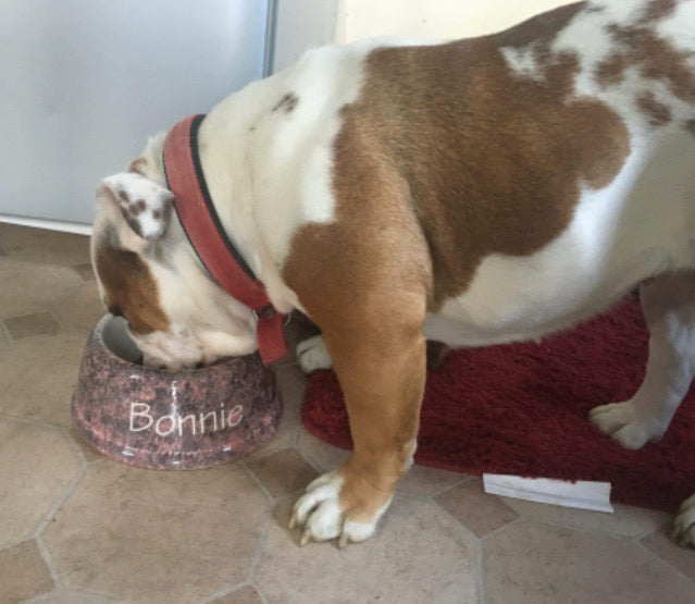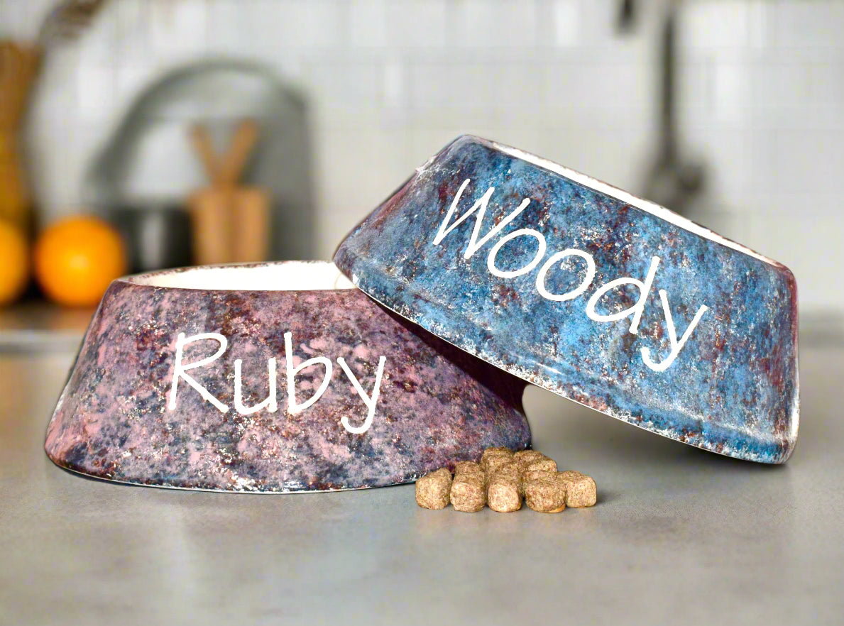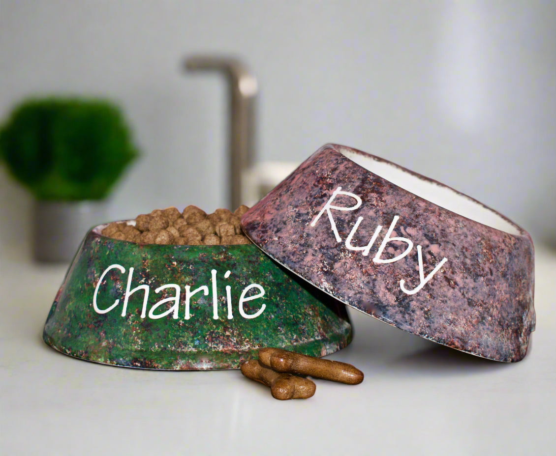 Each bowl features a unique granite-style effect and is individually painted to order with your pets name, adding a thoughtful personal touch.