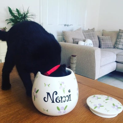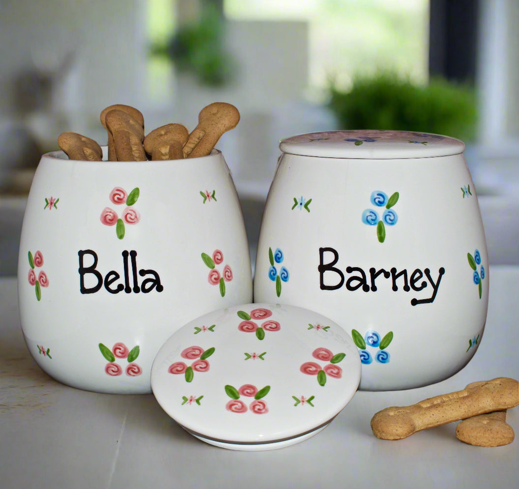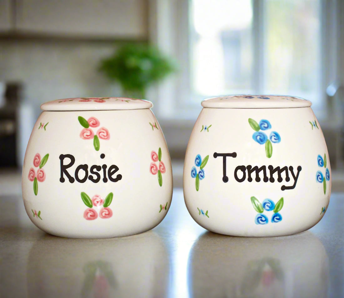 These personalised, hand-painted ceramic treat jars blend timeless simplicity with a modern touch, and come in two practical sizes: