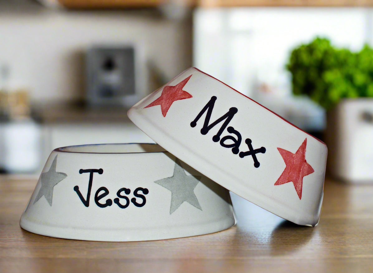 These personalised, hand-painted ceramic bowls are available in three sizes and feature a stylish star print design in your choice of colours. To further customise your bowl, you can select from four different font options for the personalisation.