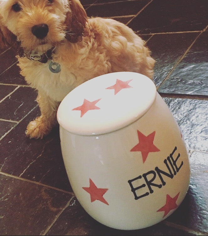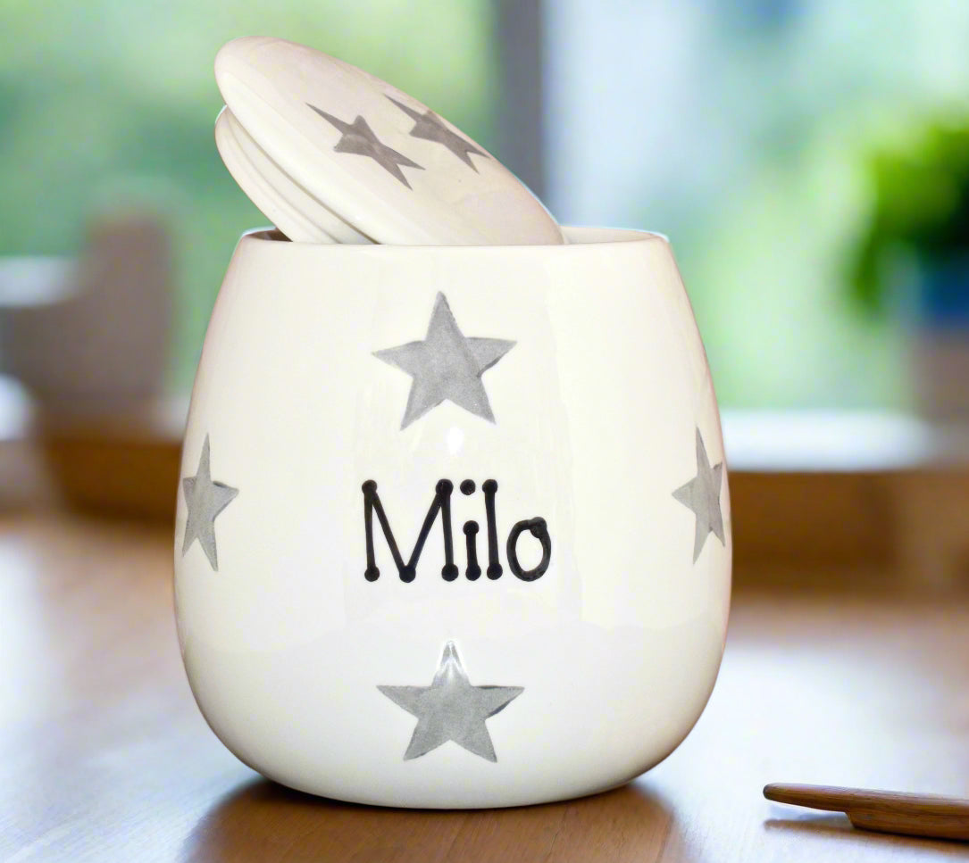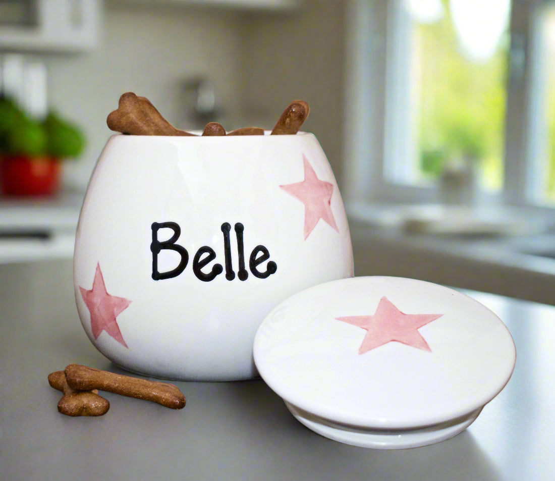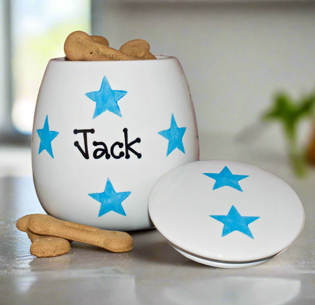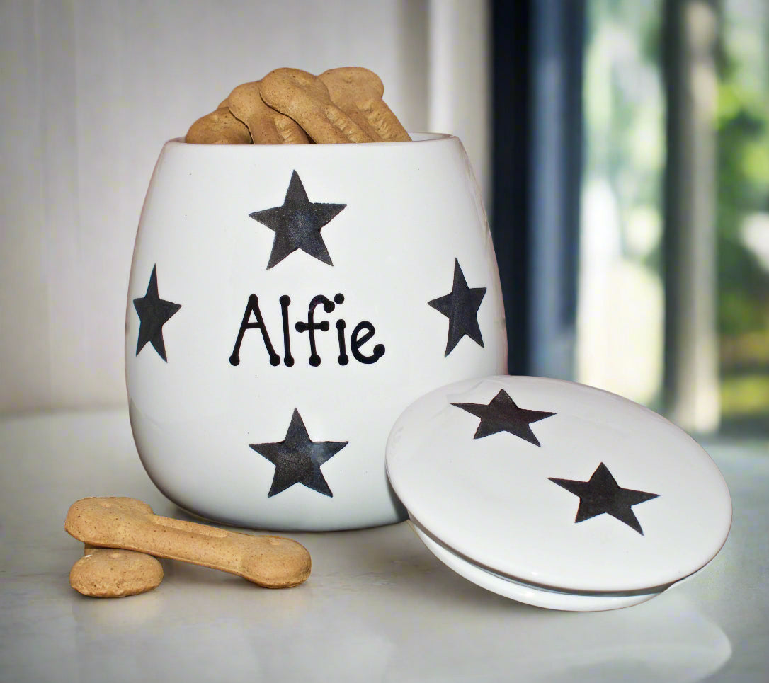 These personalised, hand-painted ceramic treat jars come in two paw-some sizes: