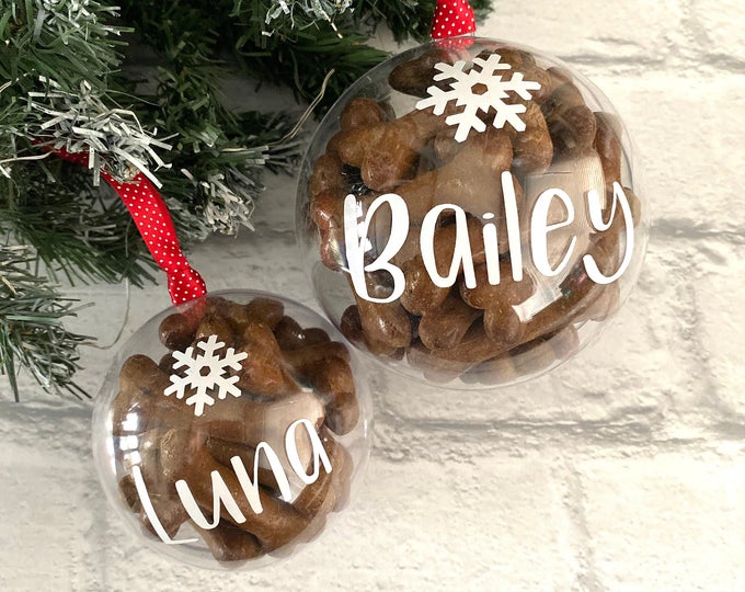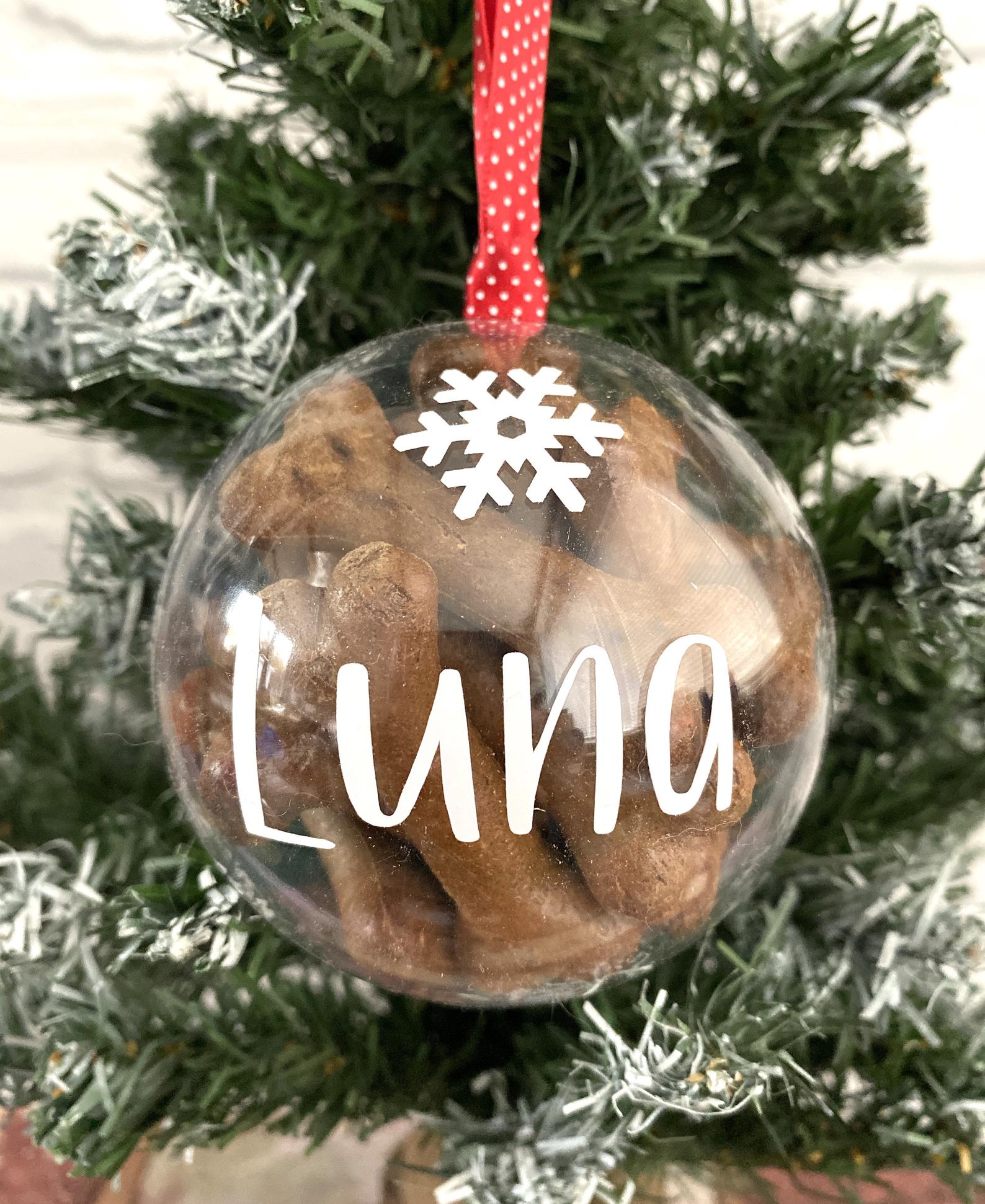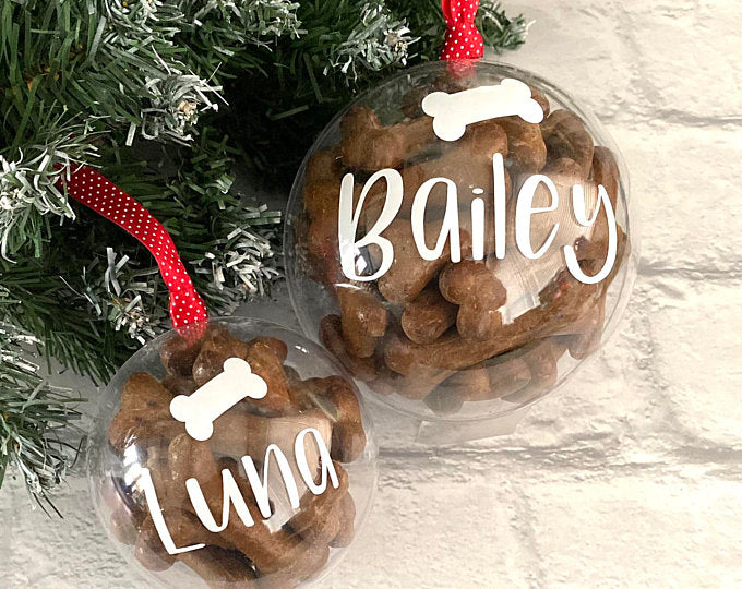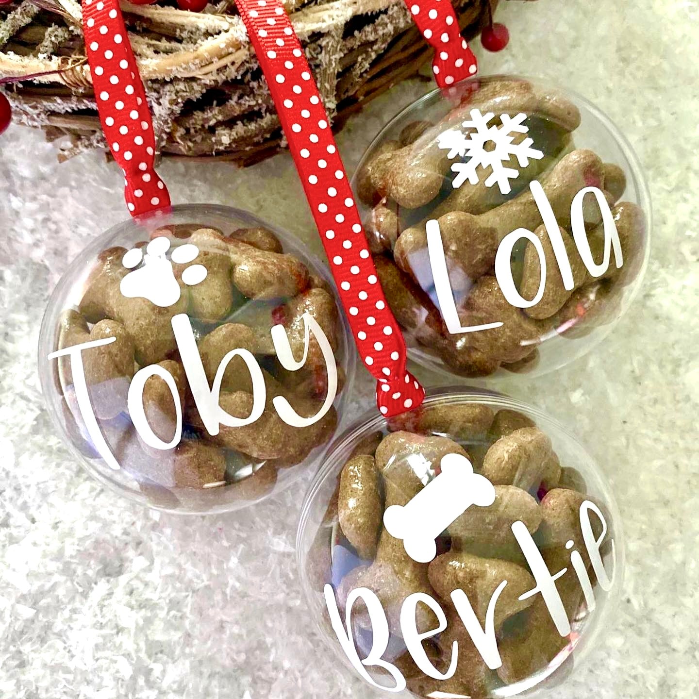Each bauble is personalised with your dogโs name in crisp white vinyl and finished with a motif of your choice โ paw, bone, or snowflake โ for that extra festive flair. Tied with a red and white spotty ribbon, it's ready to hang, gift, or unwrap with wagging tails.