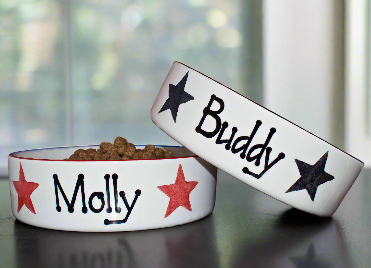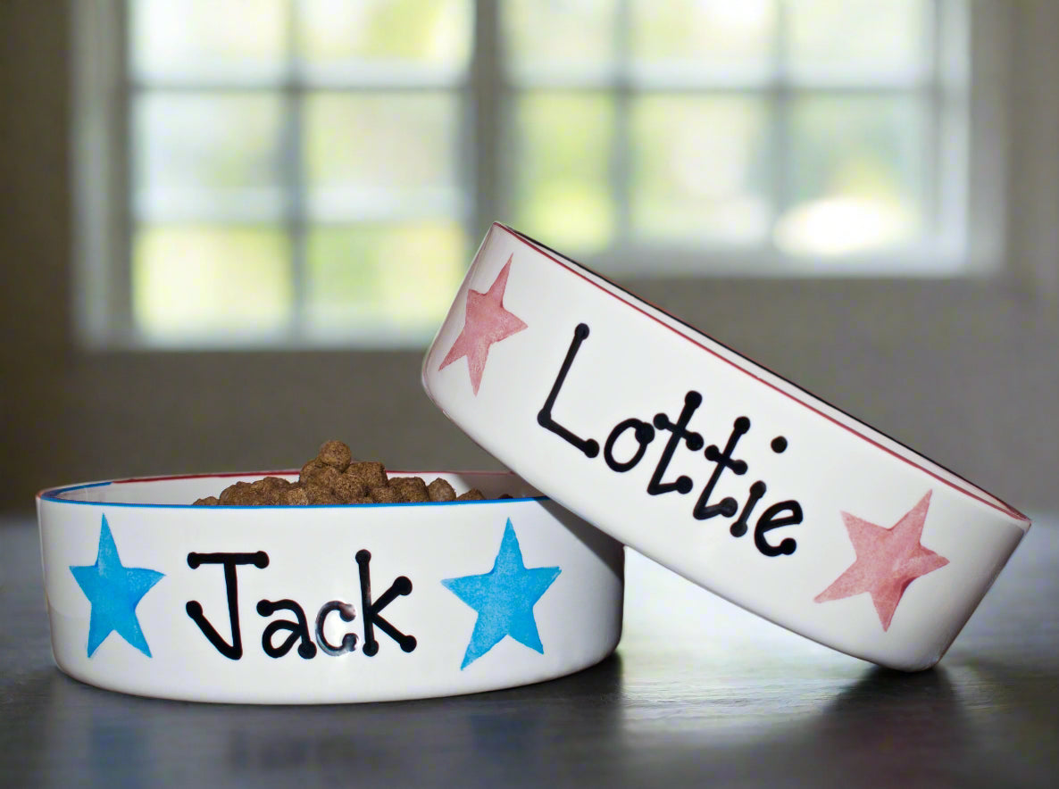 These personalised, hand-painted ceramic bowls are available in three sizes and feature a stylish star print design in your choice of colours.