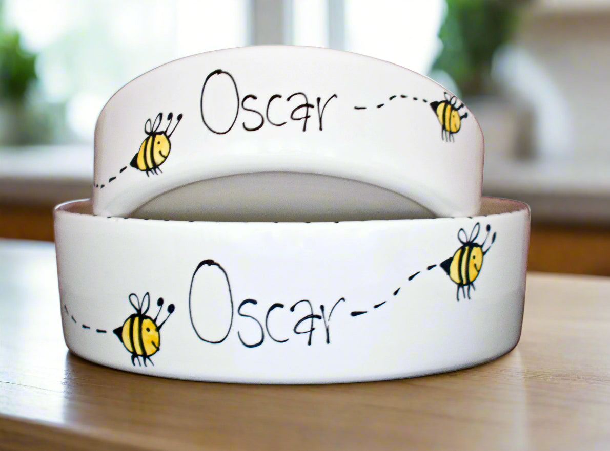 Each set is hand painted to order and features a delightful array of whimsical bees flying around each bowl. Combining practicality with playful, artistic charm, this two-bowl set is a vibrant and personal way to brighten up your pet's feeding area.