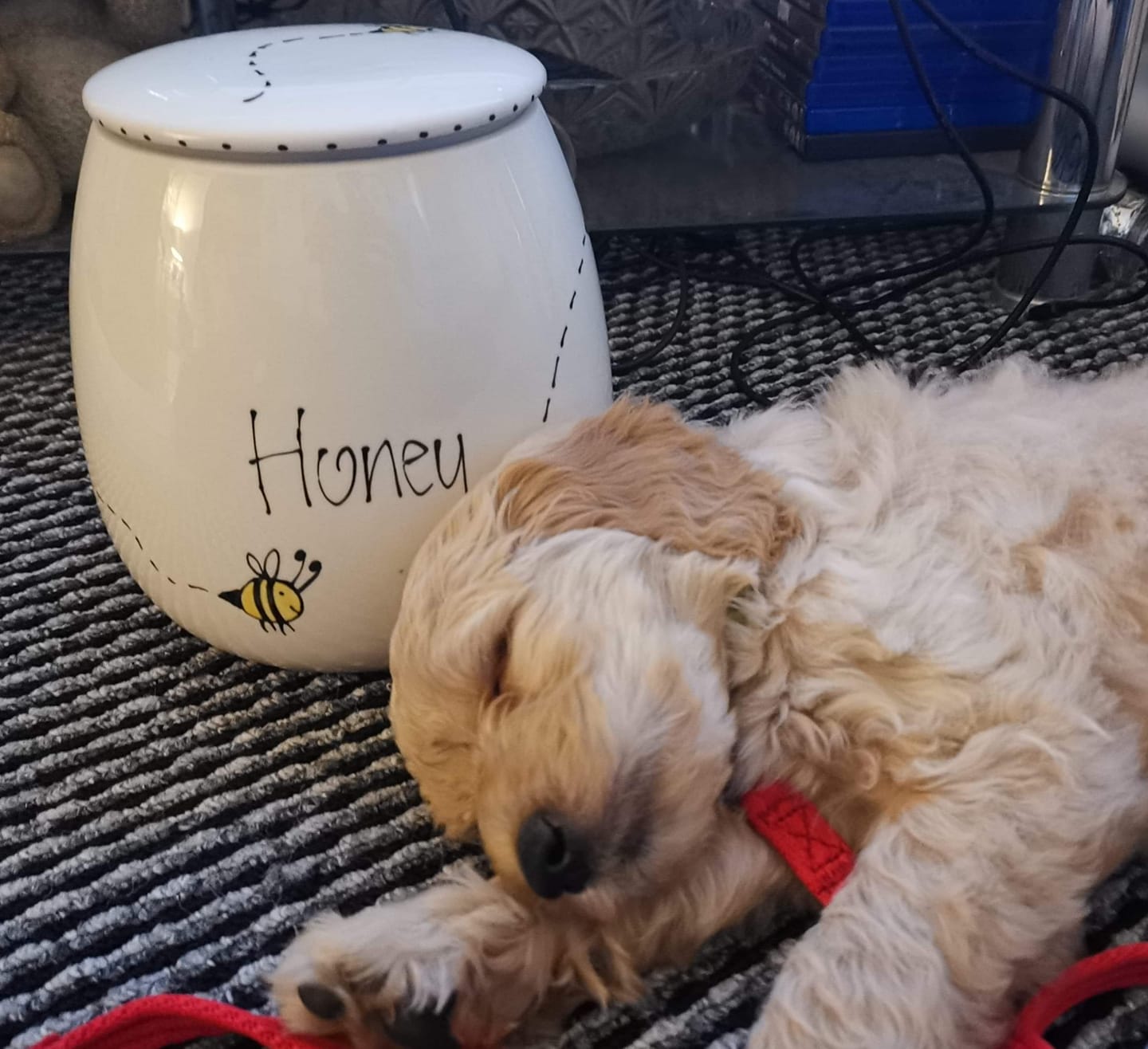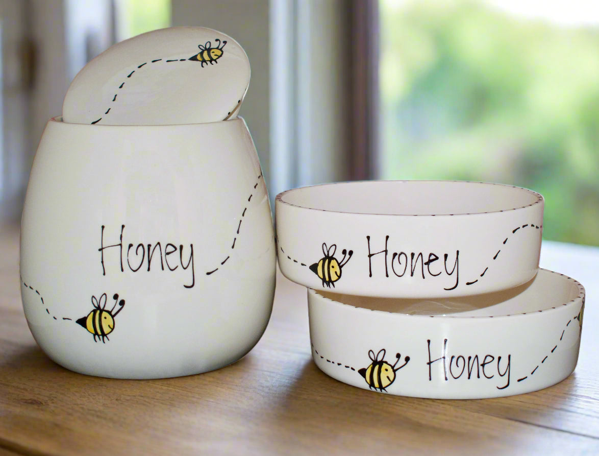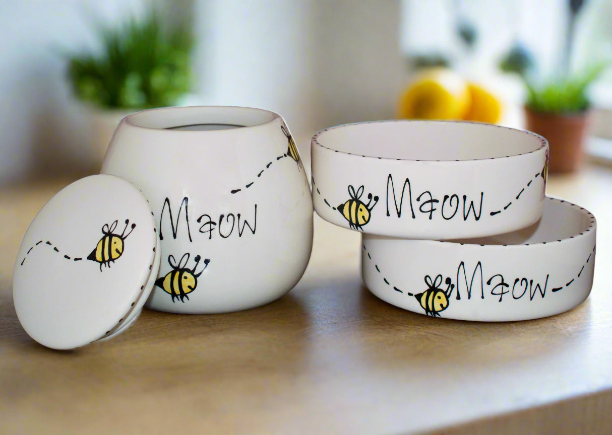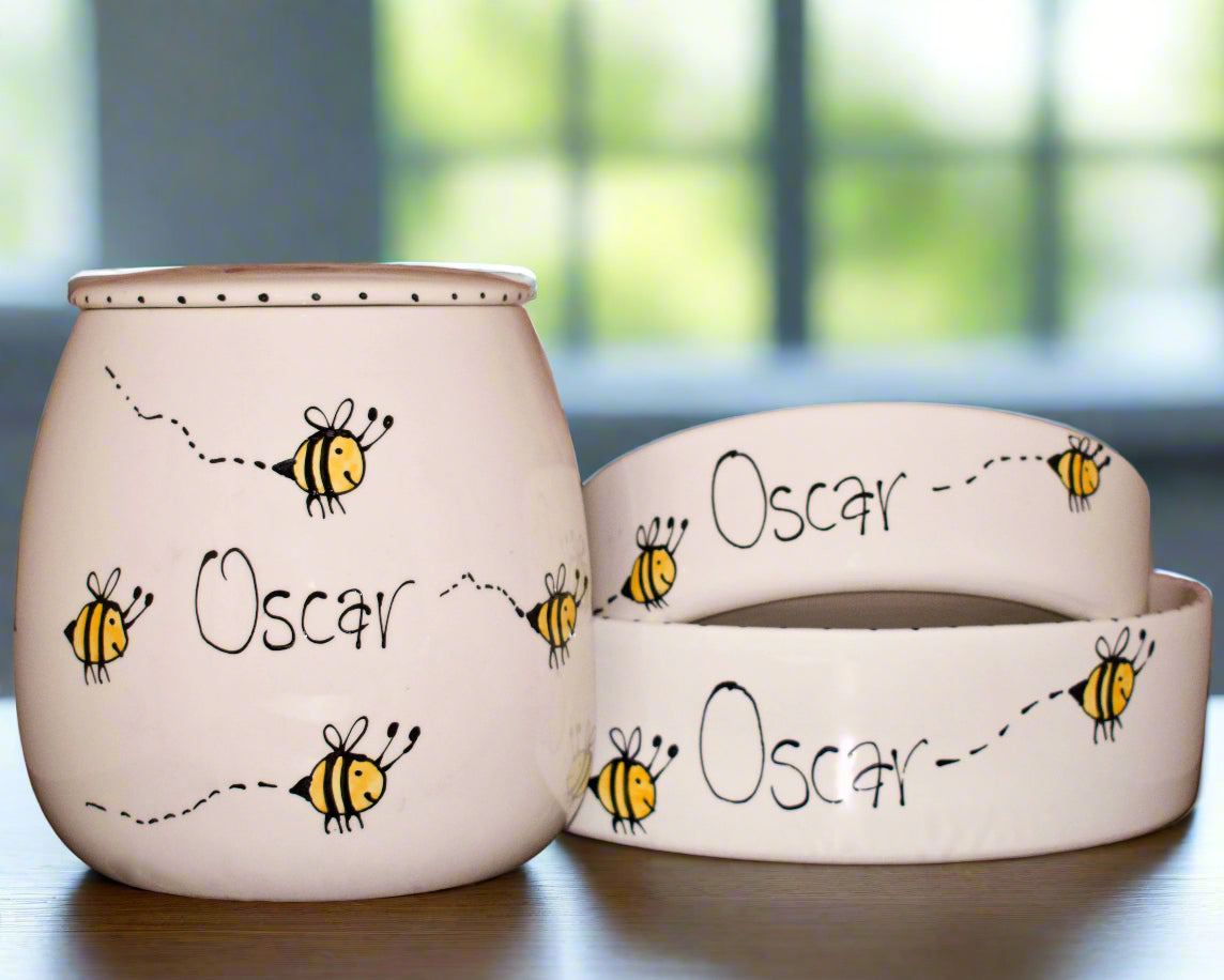 Each set is hand painted to order and features a delightful array of whimsical bees flying around each bowl. Combining practicality with playful, artistic charm, this two-bowl set is a vibrant and personal way to brighten up your pet's feeding area.