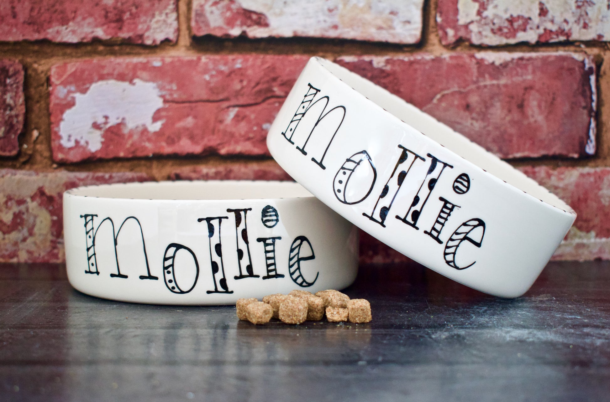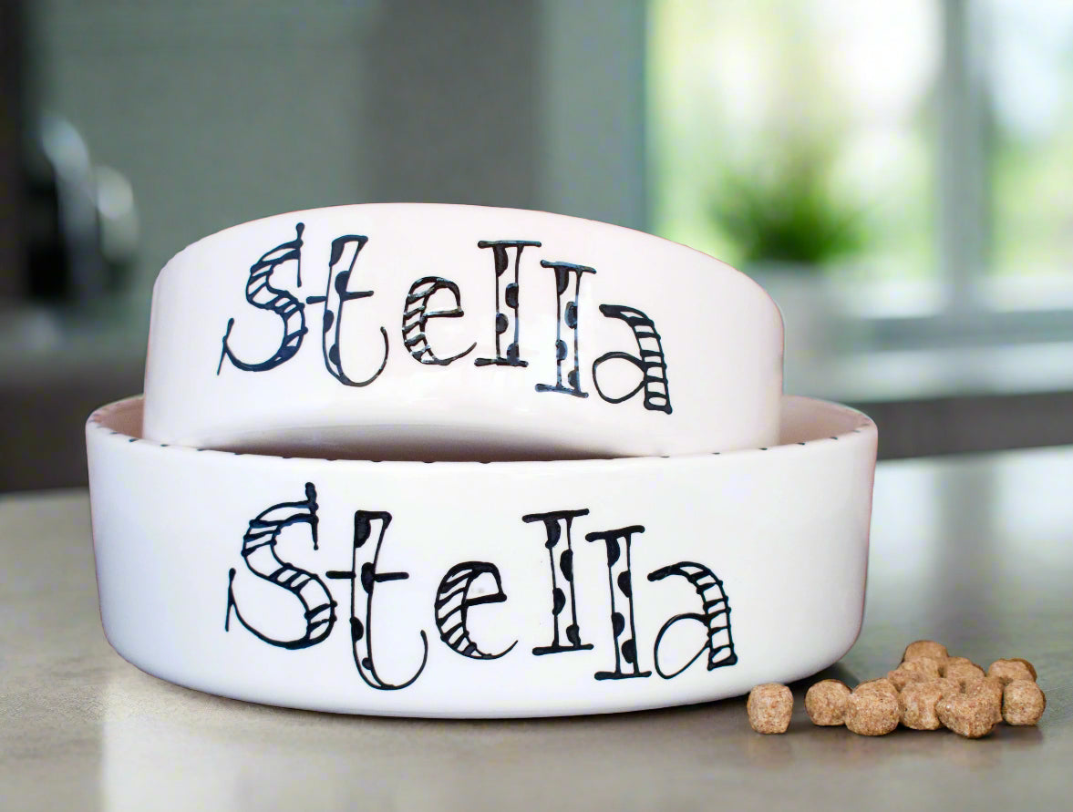 Each set is hand-painted to order in a quirky black doodle font that’s full of character. Simple, stylish, and full of charm, this two-bowl set adds a personal touch to your pet’s feeding area—because even mealtime deserves a little personality!