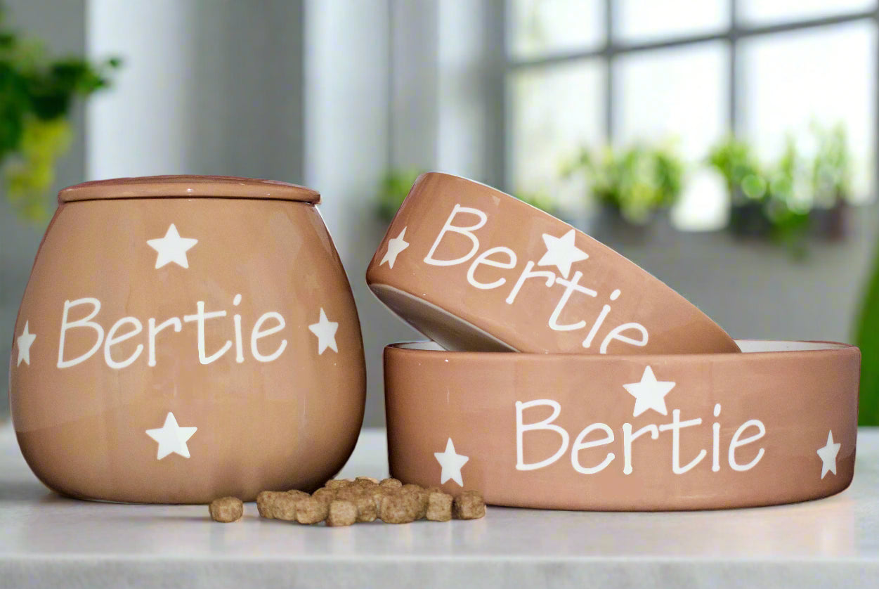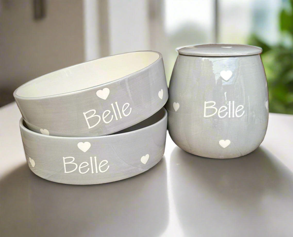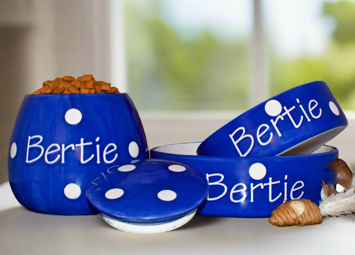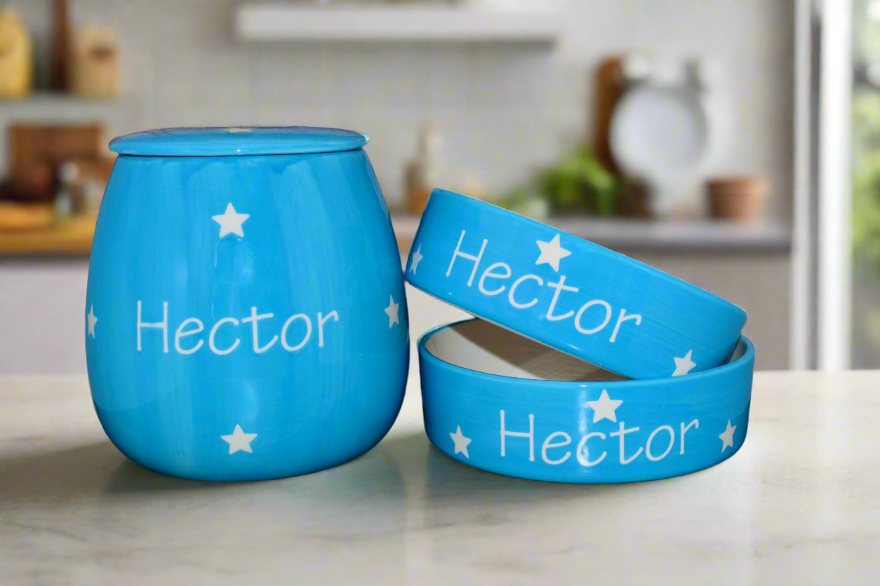 These hand-painted, personalised ceramic sets come as a set of two bowls and one treat jar. They are available in five different size combinations, ranging from two small bowls, one small jar to two large bowls, one large jar. Designed to suit pets of all sizes, the smaller sets are ideal for cats or small breed dogs, while the larger sets are perfect for medium to large dogs.