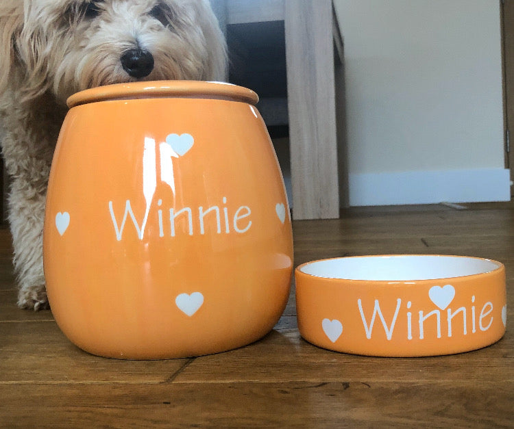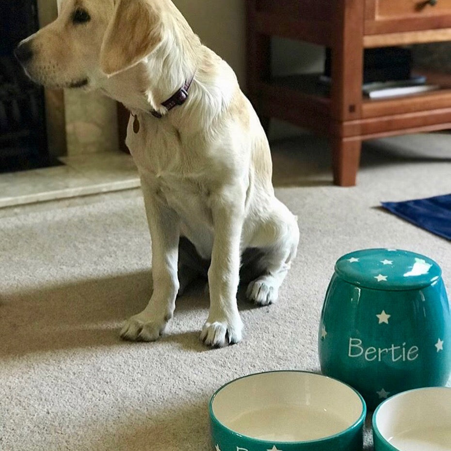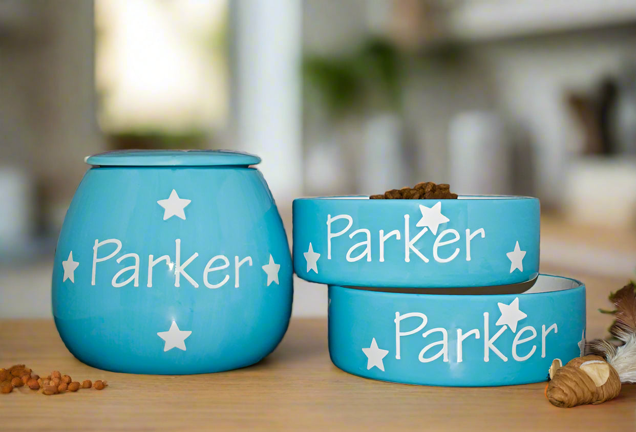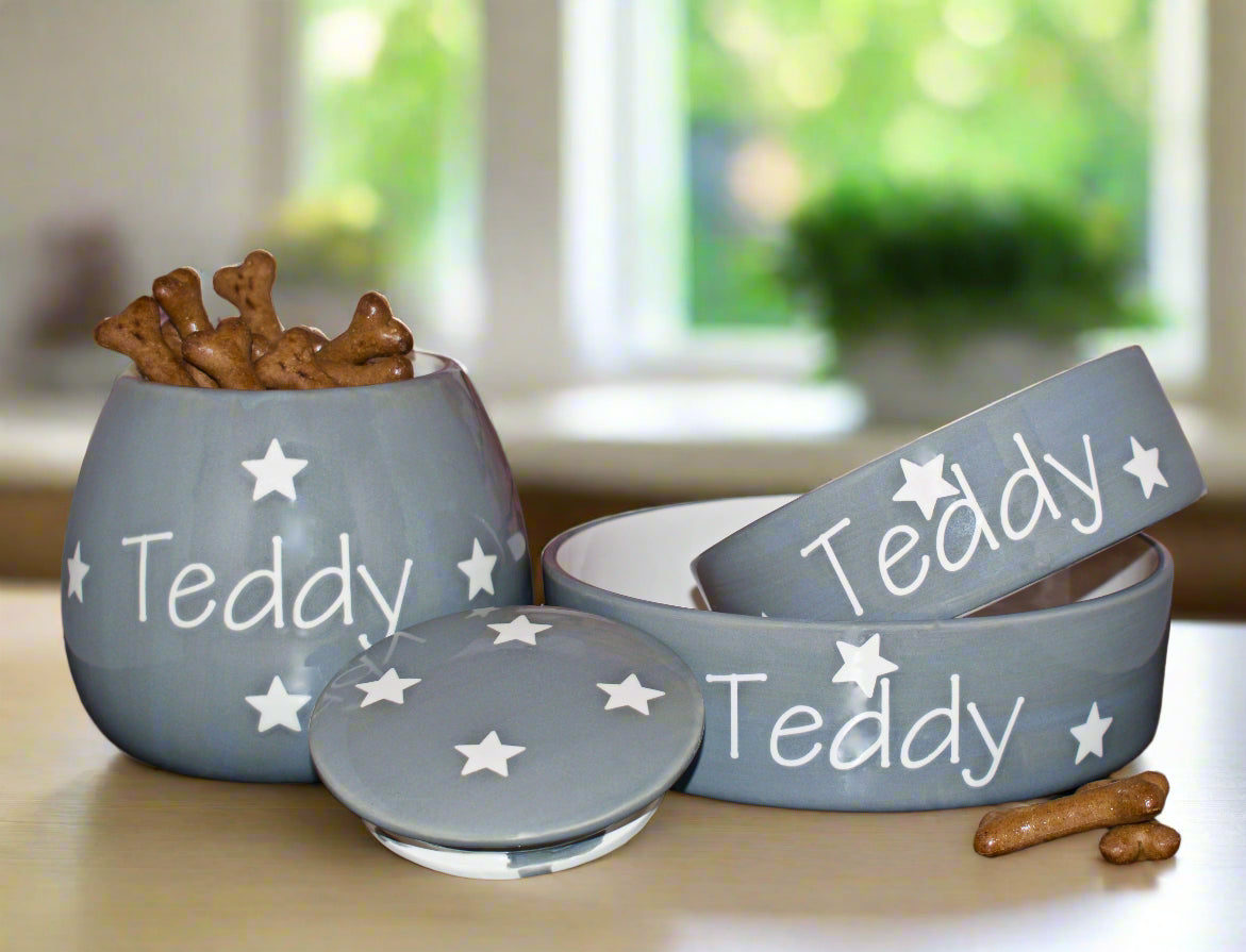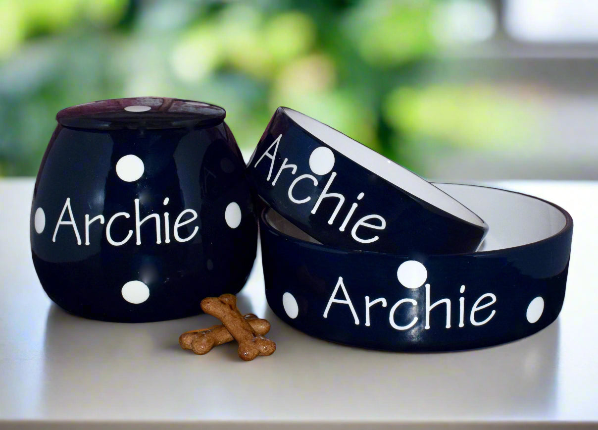 These hand-painted, personalised ceramic sets come as a set of two bowls and one treat jar. They are available in five different size combinations, ranging from two small bowls, one small jar to two large bowls, one large jar. Designed to suit pets of all sizes, the smaller sets are ideal for cats or small breed dogs, while the larger sets are perfect for medium to large dogs.