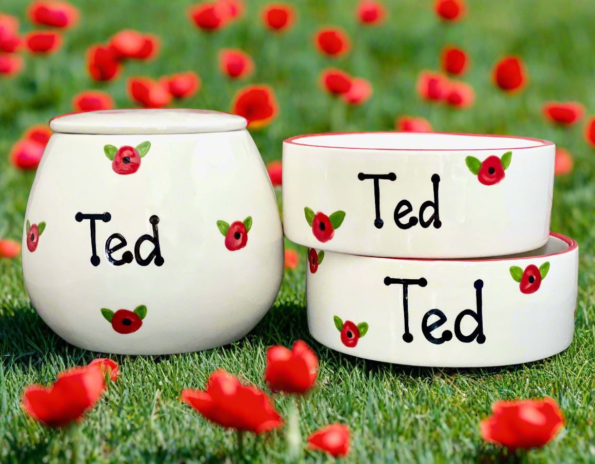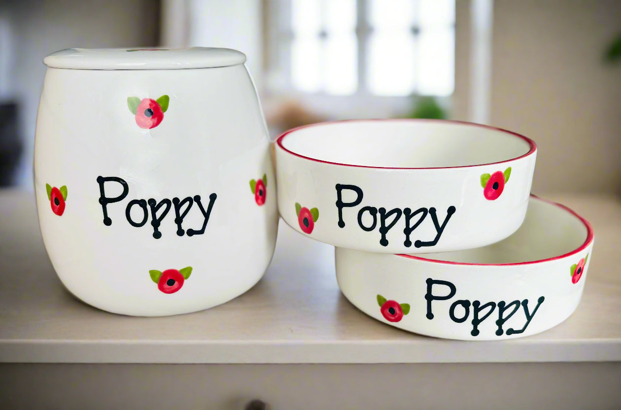 Each set features a striking hand-painted poppy design. Symbolising remembrance and resilience, each bowl is a little work of art—bold, vibrant, and full of meaning. Perfect for pet lovers who appreciate thoughtful design and timeless beauty.