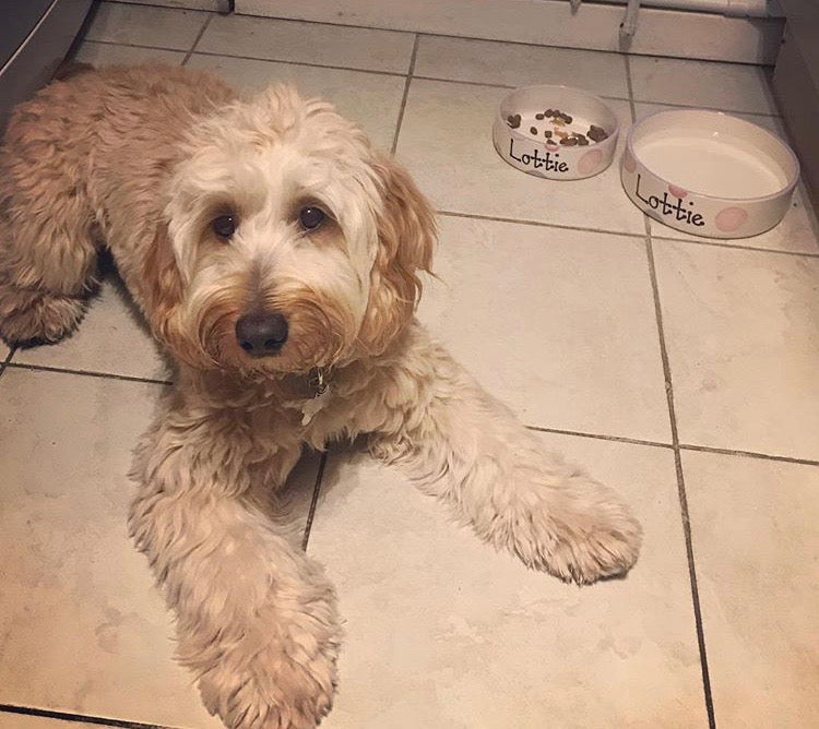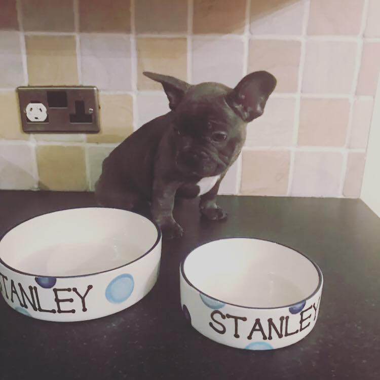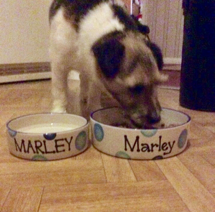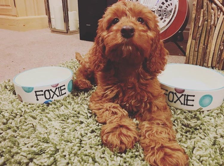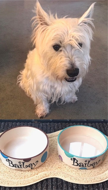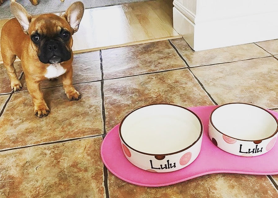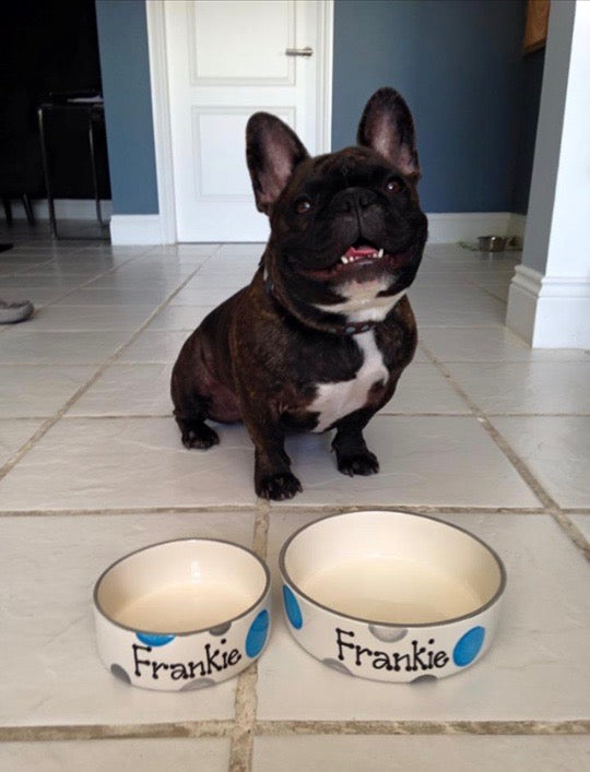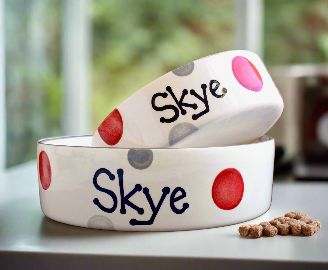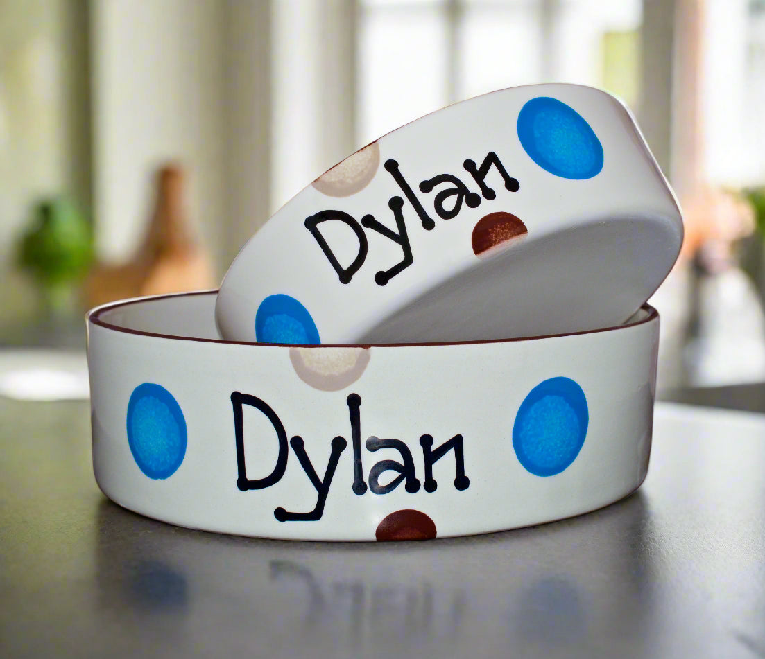 Each set is hand painted to order in your choice of font and colours. Combining practicality with playful, artistic charm, this two-bowl set is a vibrant and personal way to brighten up your pet's feeding area.