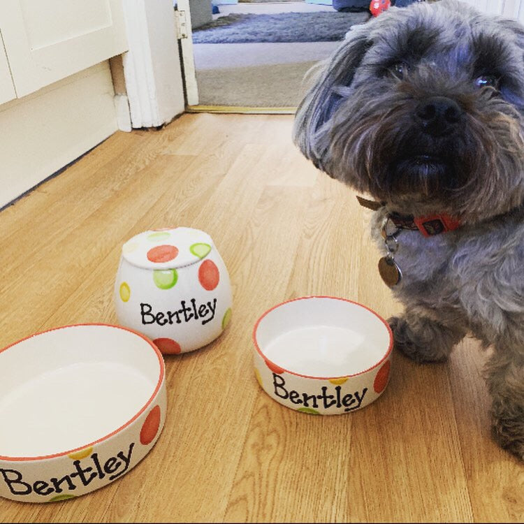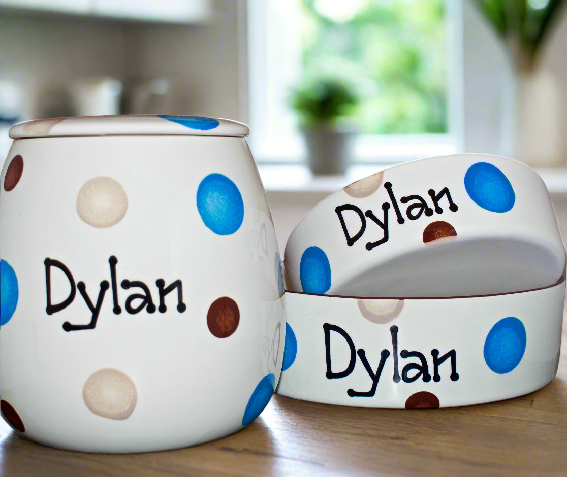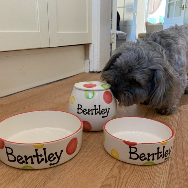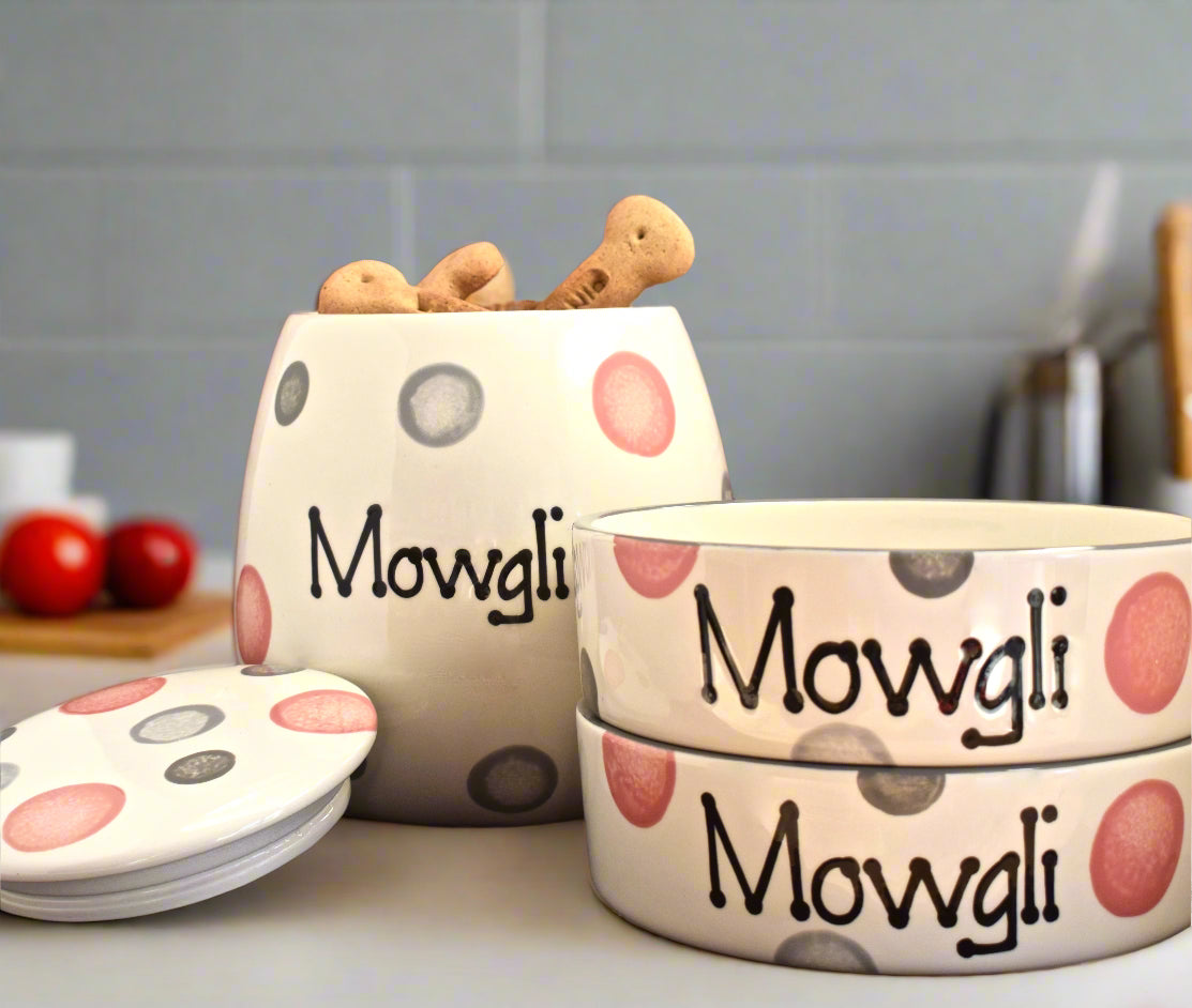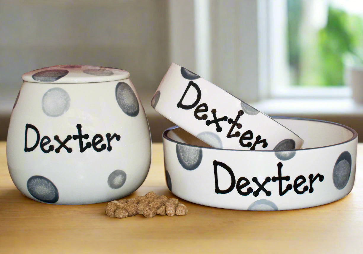 These hand-painted, personalised ceramic sets come as a set of two bowls and one treat jar. They are available in six different size combinations, ranging from two small bowls, 1 small treat jar to two large bowls, a large treat jar. Designed to suit pets of all sizes, the smaller sets are ideal for cats or small breed dogs, while the larger sets are perfect for medium to large dogs.