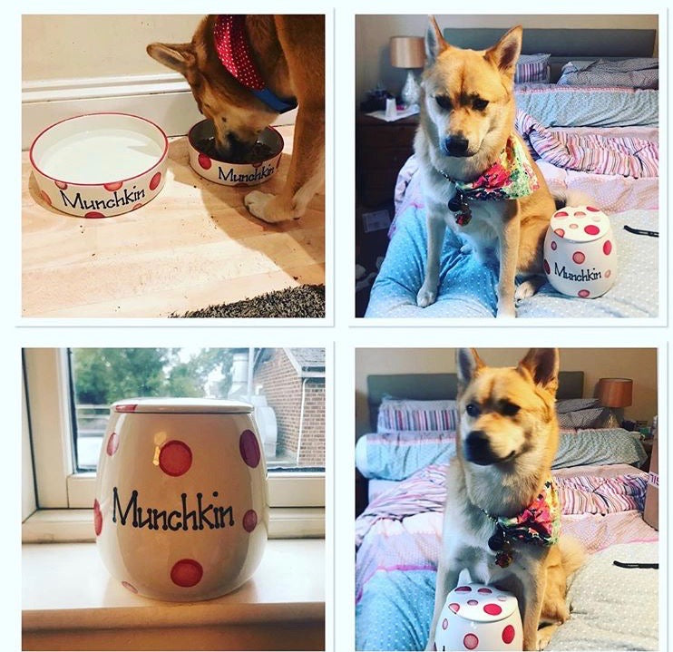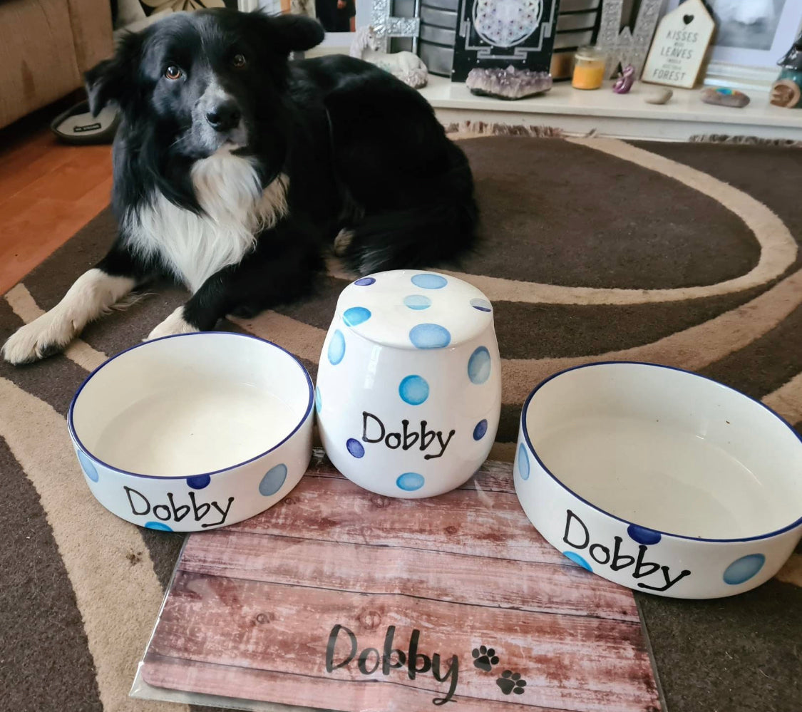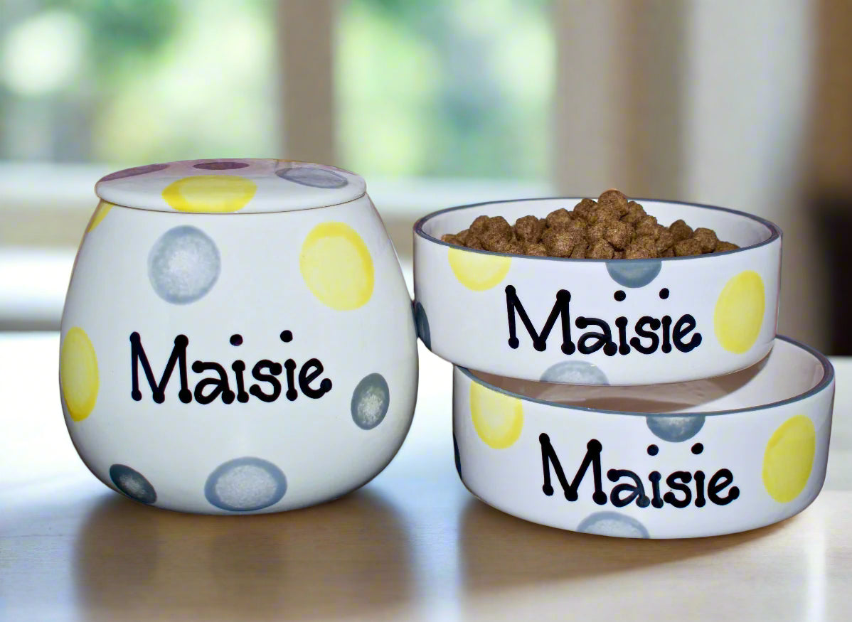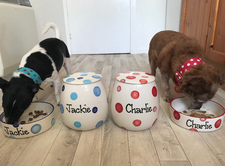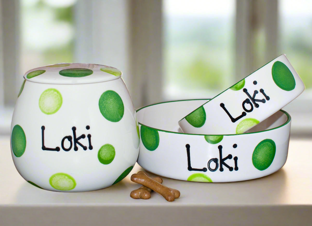 These hand-painted, personalised ceramic sets come as a set of two bowls and one treat jar. They are available in six different size combinations, ranging from two small bowls, 1 small treat jar to two large bowls, a large treat jar. Designed to suit pets of all sizes, the smaller sets are ideal for cats or small breed dogs, while the larger sets are perfect for medium to large dogs.