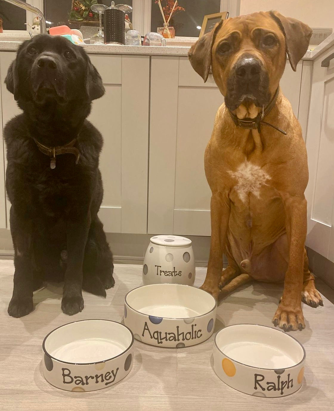 Each set is hand painted to order in your choice of font and colours. Combining practicality with playful, artistic charm, this two-bowl set is a vibrant and personal way to brighten up your pet's feeding area.