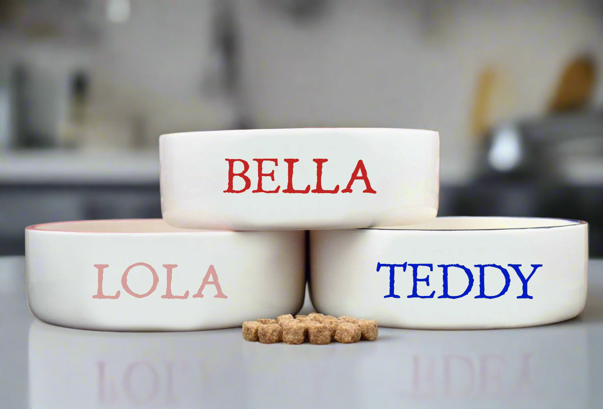 Available in three sizes, each bowl features your pet’s name hand-painted in a bold, playful stamp-style font. You can choose the colour too — the text and the rim will match perfectly for a bright, coordinated look. Packed with personality and charm, these bowls are the perfect way to make every meal feel a little more special!