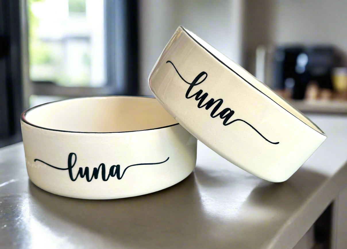 Each set is meticulously hand-painted to order in a graceful, refined swash font, offering a touch of understated elegance. Marrying minimalist charm with timeless sophistication, this exquisite two-bowl set brings bespoke beauty and elevated style to your pet’s dining space.